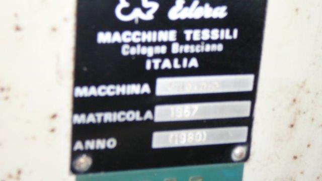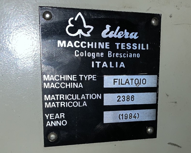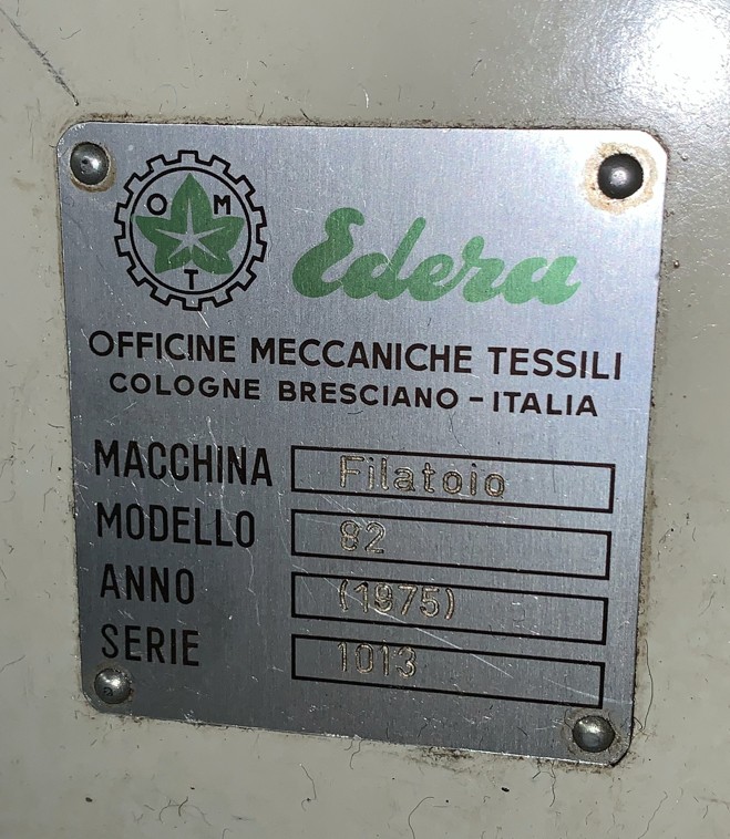 Edera, year 1980, 6 spindles, pitch 82,5 mm, ring-Ø 56 mm, tubes 240 mm, double apron draftingSystem for longstaple, max. drafting system width 220 mm, change of turns/ and draft, spindle speed byVariable gearboxes, width 600 mm, length 550 mm, high with creel ca. 2.200 mm