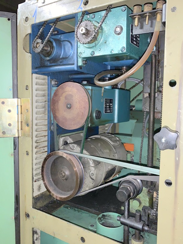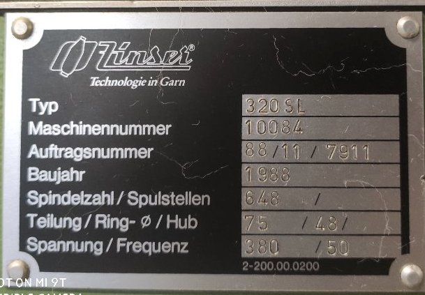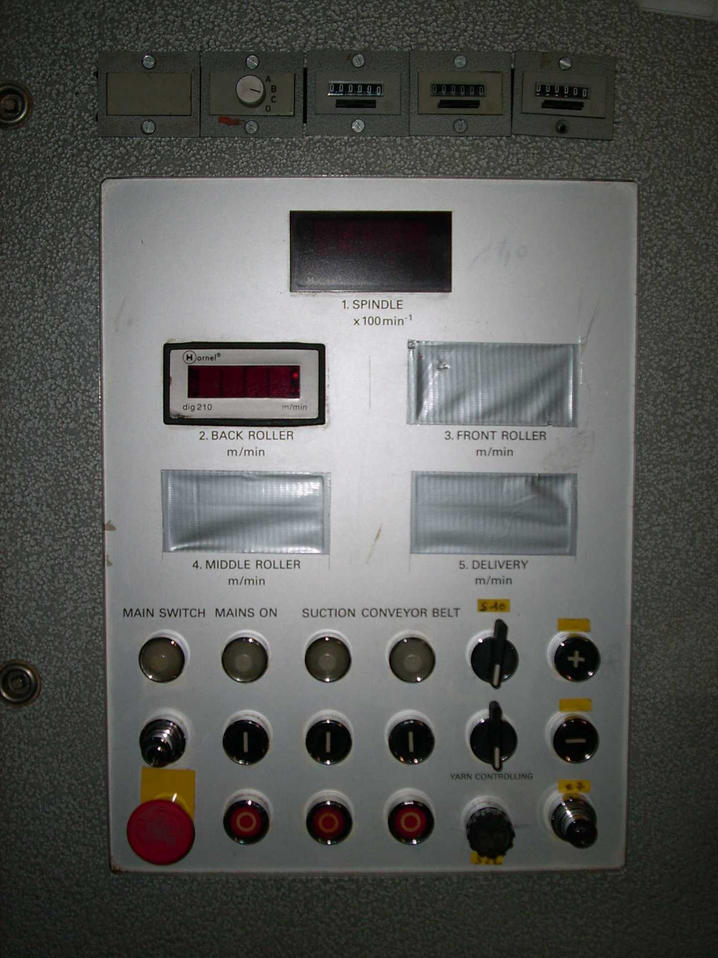 6 spindles, pitch 82,5 mm, ring-dia. 50 mm, tubes 220 mm length, double apron drafting system SKF for long staple (worsted yarn), suction pipes for broken ends, suction box with fan for waste, spindle speed variable by inverter, change of draft and turns/m by variable gear boxes, motor 0,75 kW, 400V, 50 Hz, loaded on EURO-pallet