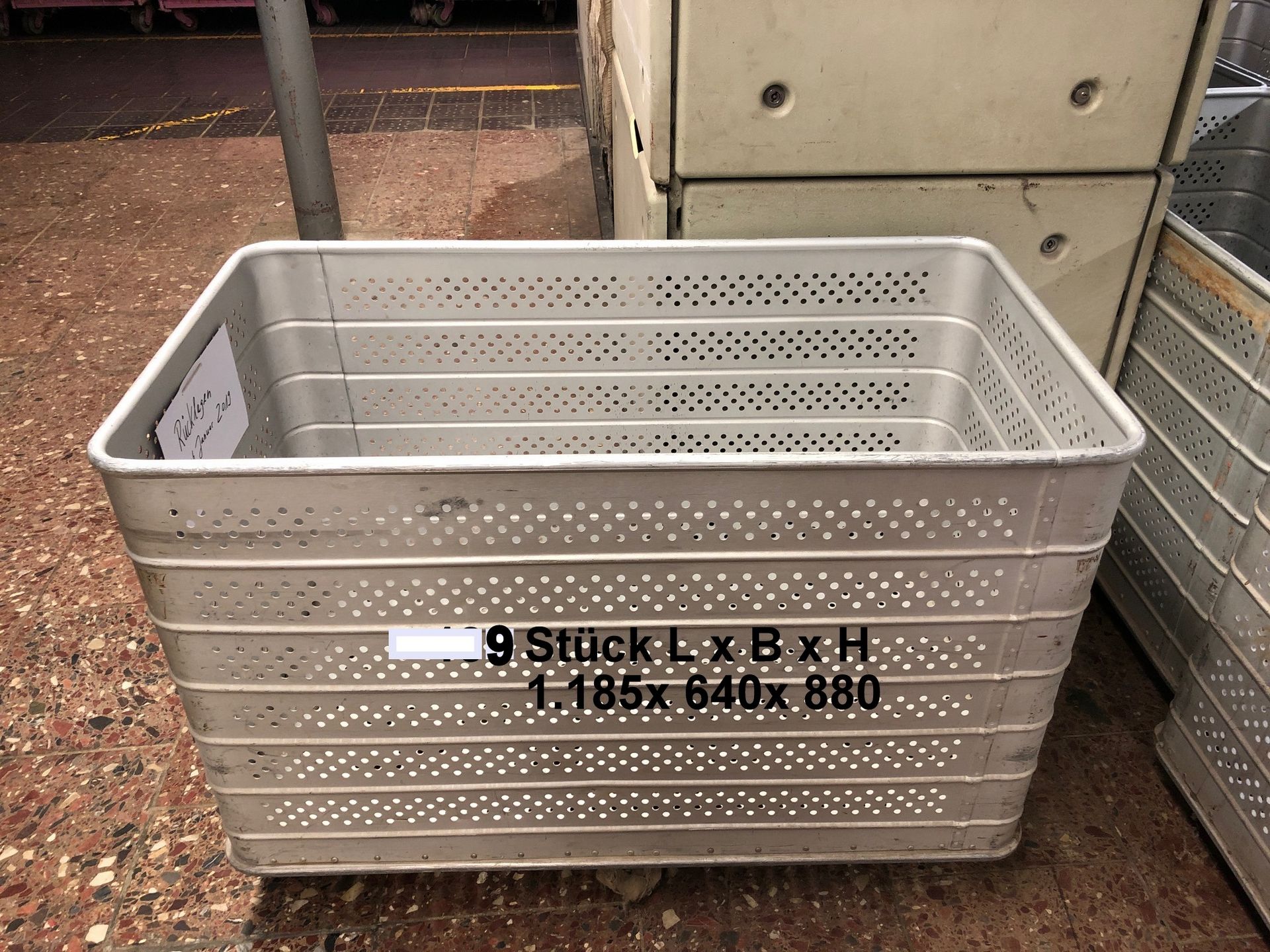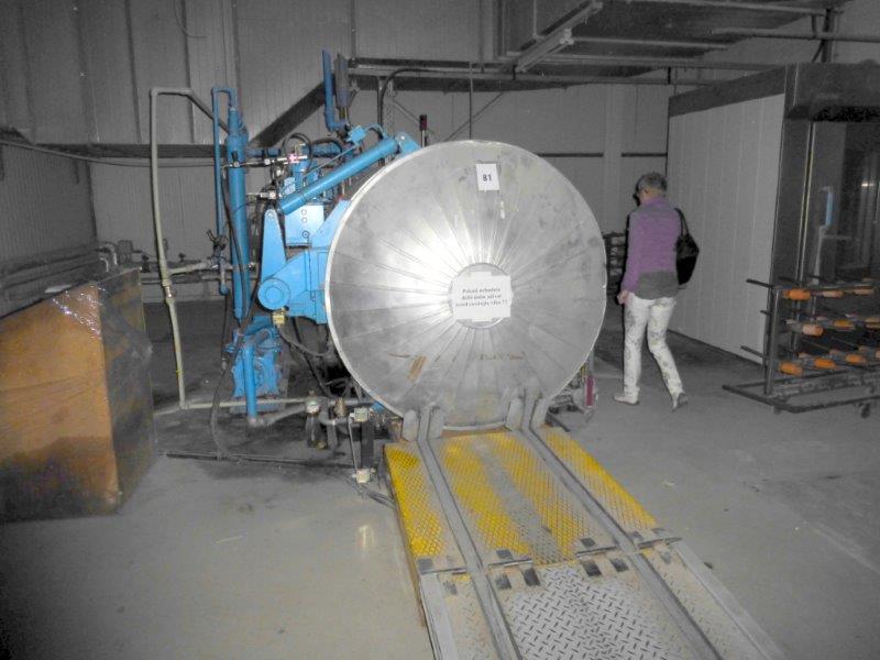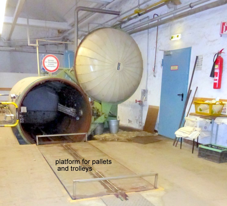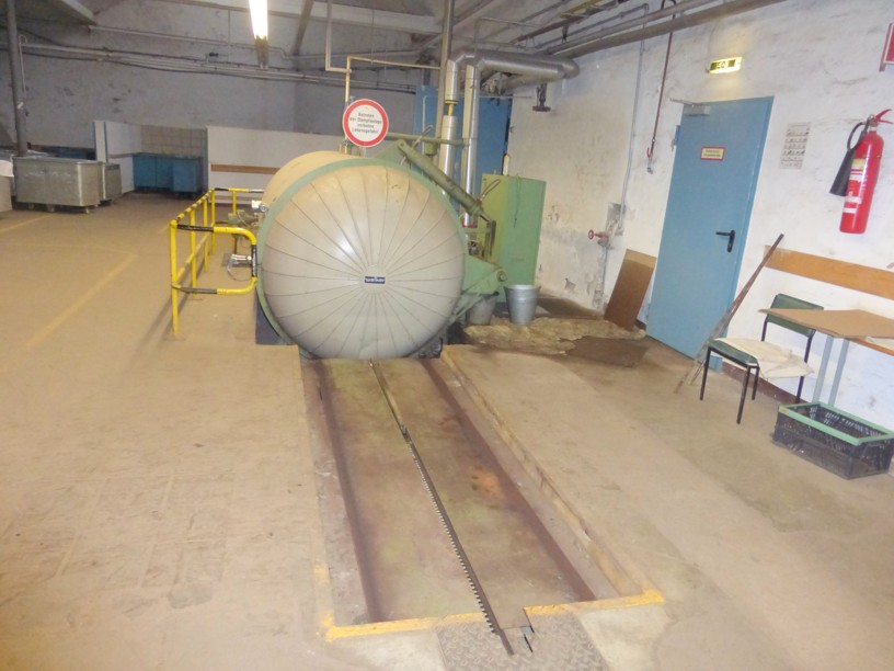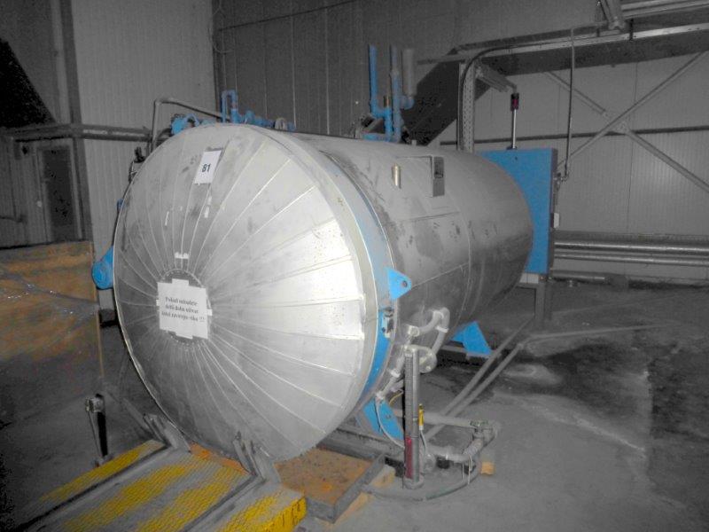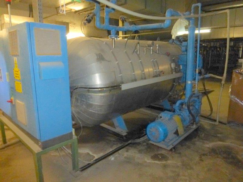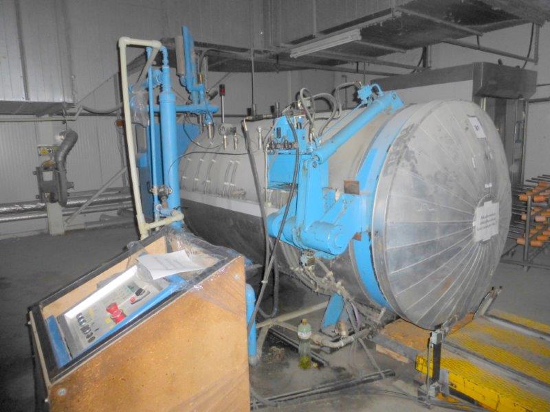 4 bar, 150°C, capacity 7.200l, diameter inside 1.600mm, length inside 3.500mm, transport platform with motor for 4 pallets 800x1.200mm and trolleys, including 6 perforated Alu-trolleys vacuum pump Sihi, type LPHA55316, motor 11kW, 380V/3Ph/50HZ