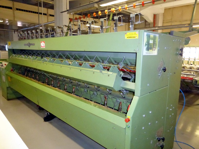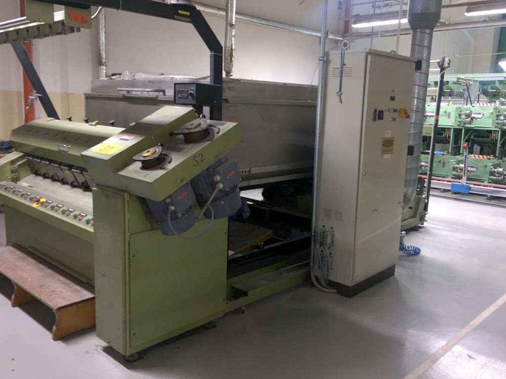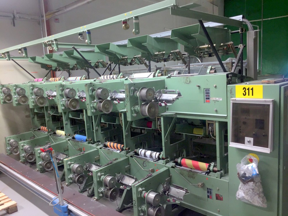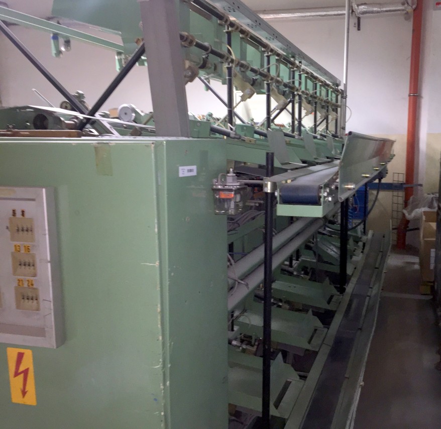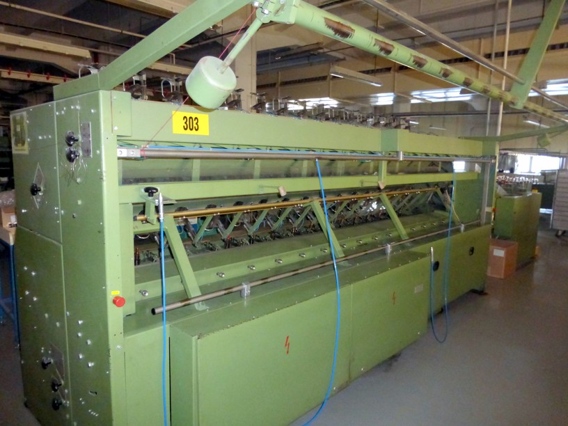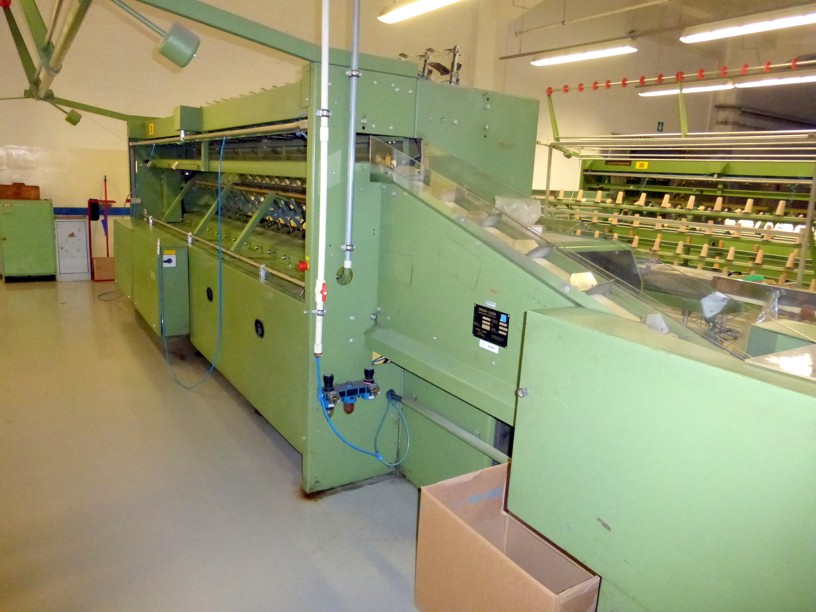 12 spindles, 10” traverse, cylindrical tubes 280 mm, meter counter, automatic doffer, conveyor fur full cones, 380V/3Ph/50Hz, very good condition, still in working position
