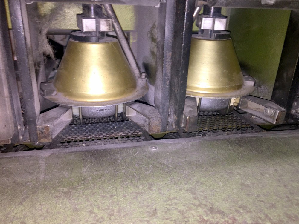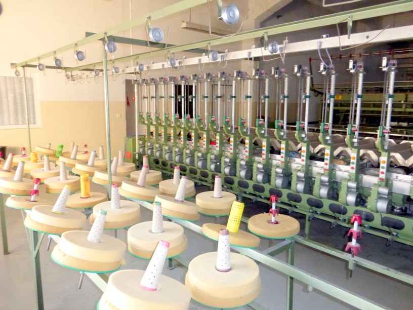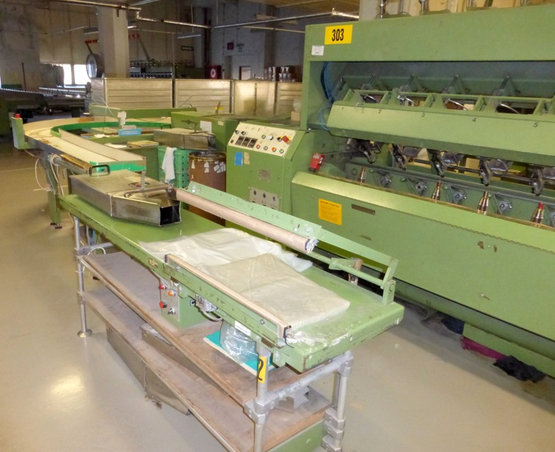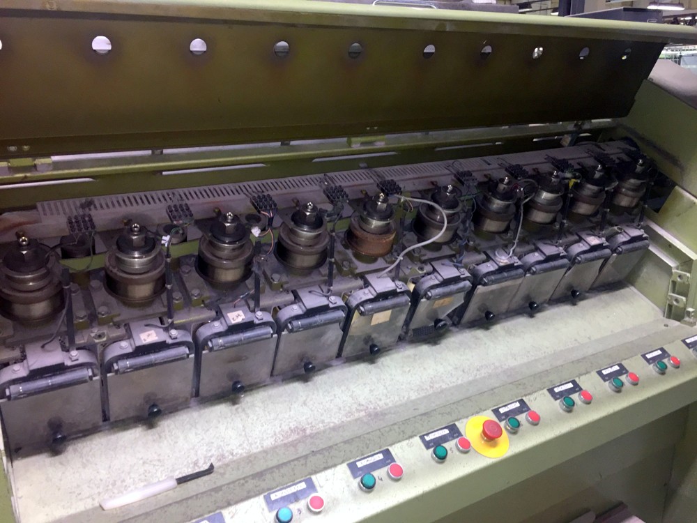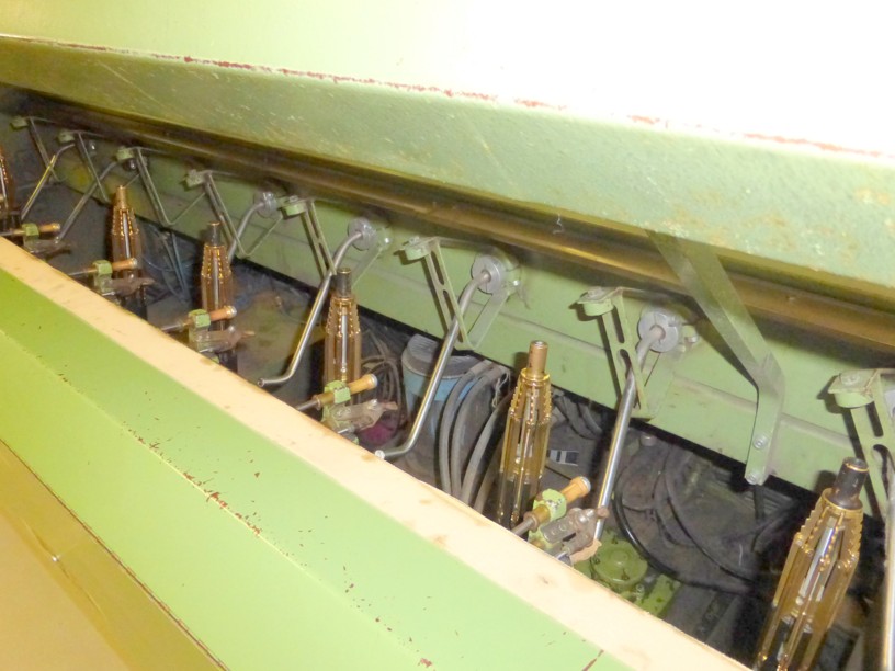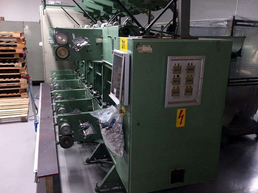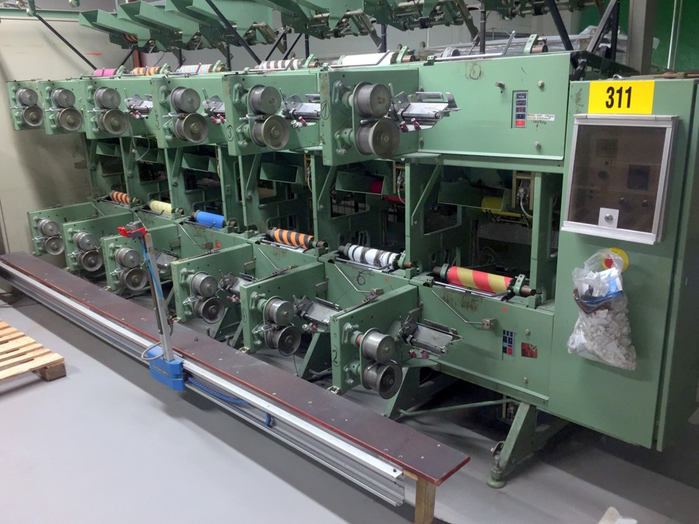 12 spindles, 10” traverse, cylindrical tubes 280 mm, meter counter, automatic doffer, conveyor fur full cones, 380V/3Ph/50Hz, very good condition, still in working position
