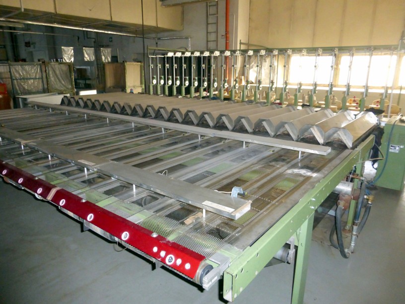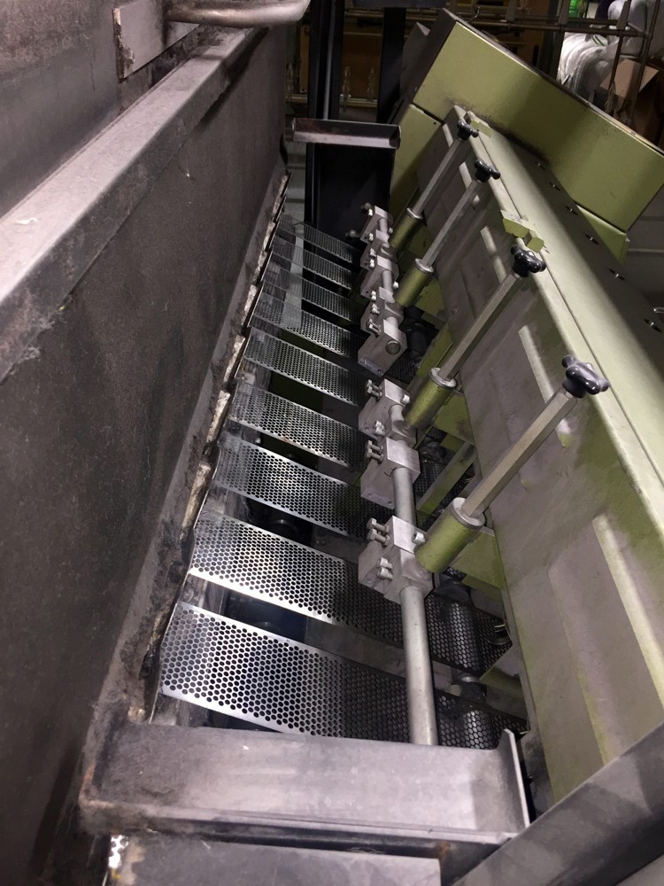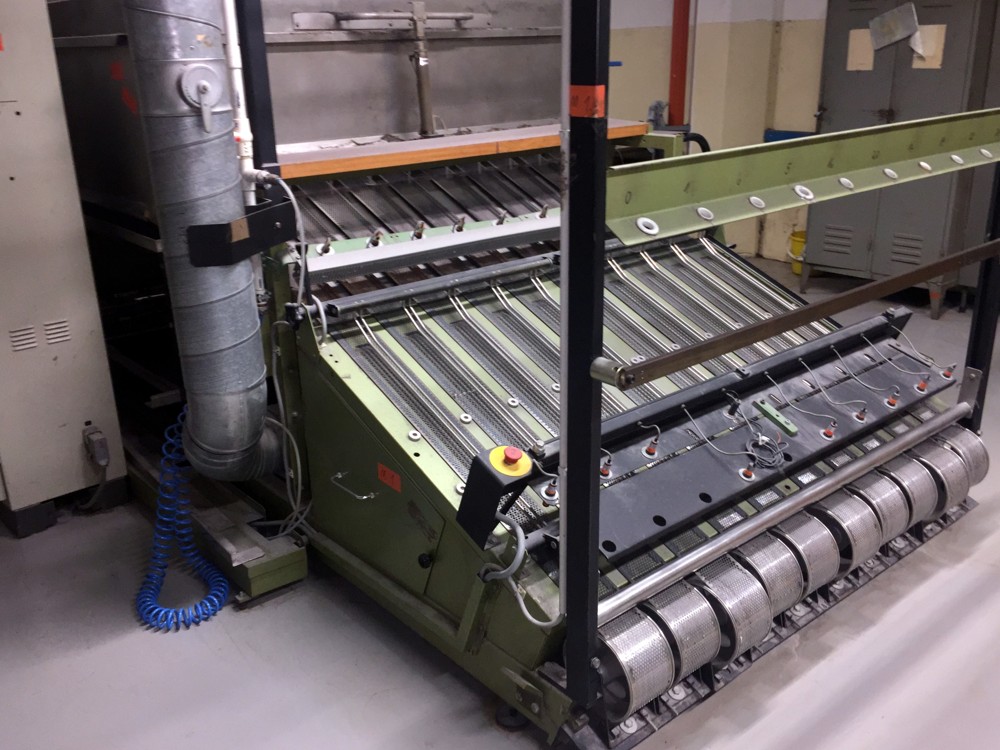 with 10 conveyors, perforated stainless steel tapes, steam heated 98°C, variable speed 300-600 m/min, 380V/3Ph/50Hz, very good condition, still in working position
