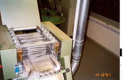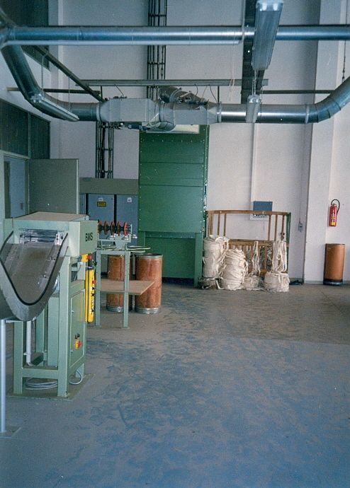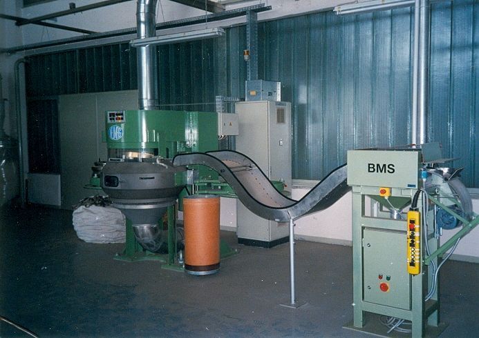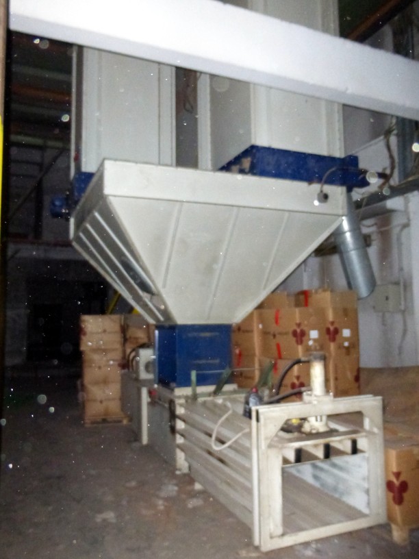 1988, pressure ca. 20 t.,feeding by 3 vertical dust collectors LTG type AVA 1000bale dimension ca. 700 x 700 x 1200 mm,bale weight 80 – 120 kg